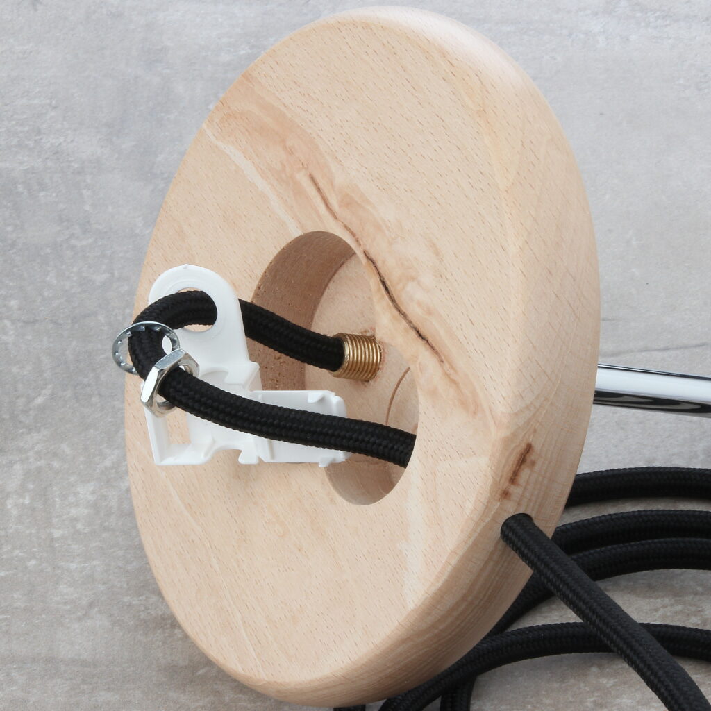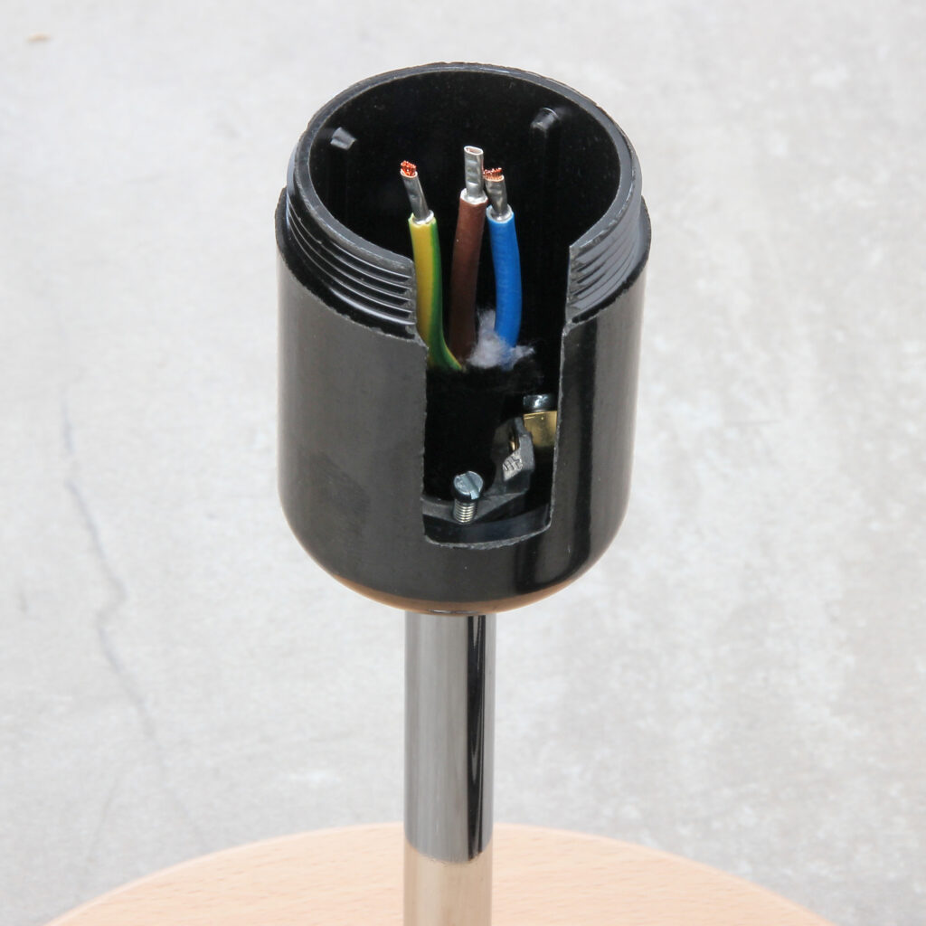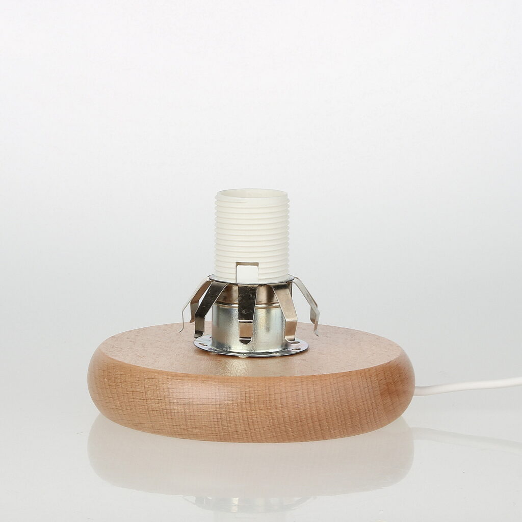 Nachfolgend zeigen wir ein Anwendungsbeispiel für eine Holzsockel-Lampe mit einer E14-Lampenfassung aus Kunststoff, die mit zwei Schraubringen zur Befestigung des Lampenschirms ausgestattet ist. In Kombination mit einer PVC-Anschlussleitung eignet sich diese Ausführung ausschließlich für Glaslampenschirme mit zweiseitiger Öffnung.