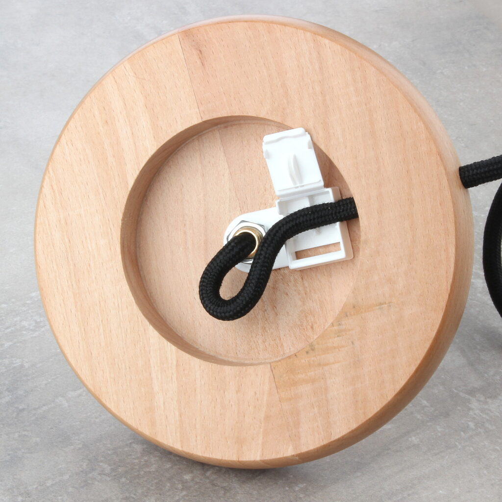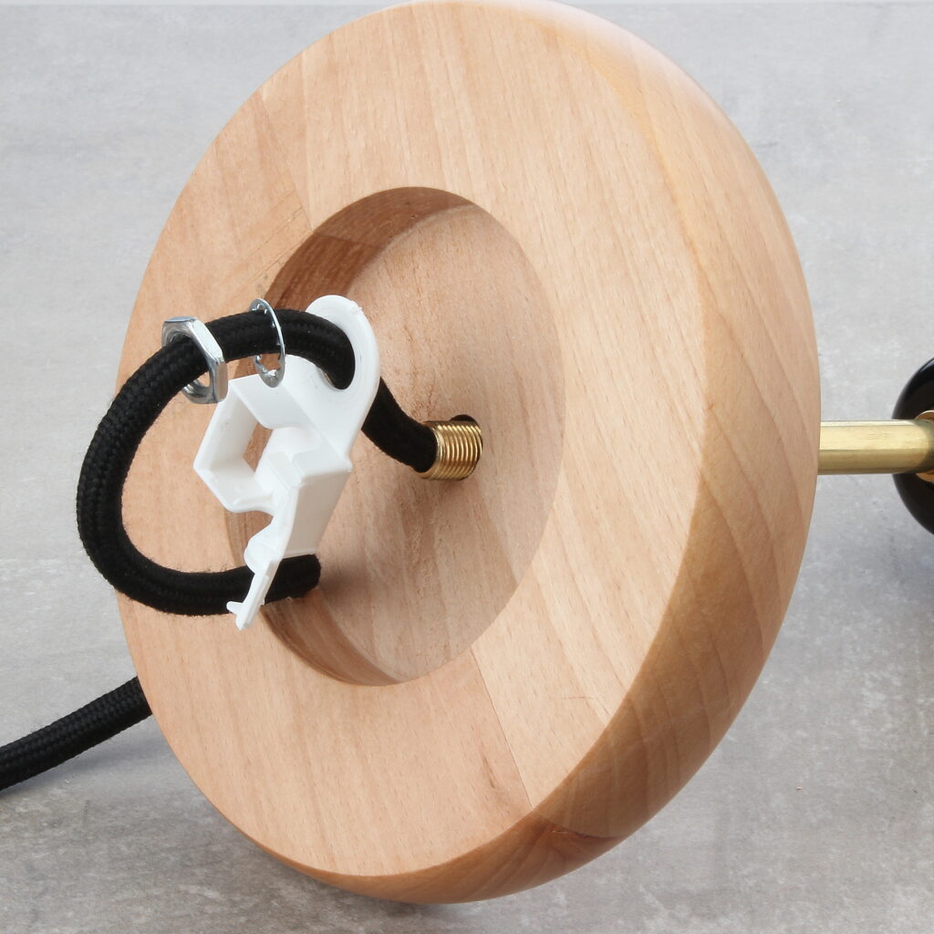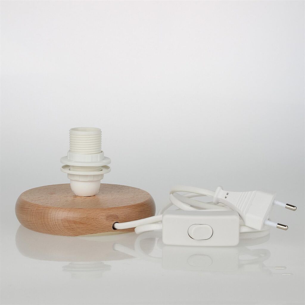 Nachfolgend zeigen wir ein Anwendungsbeispiel für eine Holzsockel-Lampe mit einer E14-Lampenfassung aus Kunststoff, die mit zwei Schraubringen zur Befestigung des Lampenschirms ausgestattet ist. In Kombination mit einer PVC-Anschlussleitung eignet sich diese Ausführung ausschließlich für Glaslampenschirme mit zweiseitiger Öffnung.