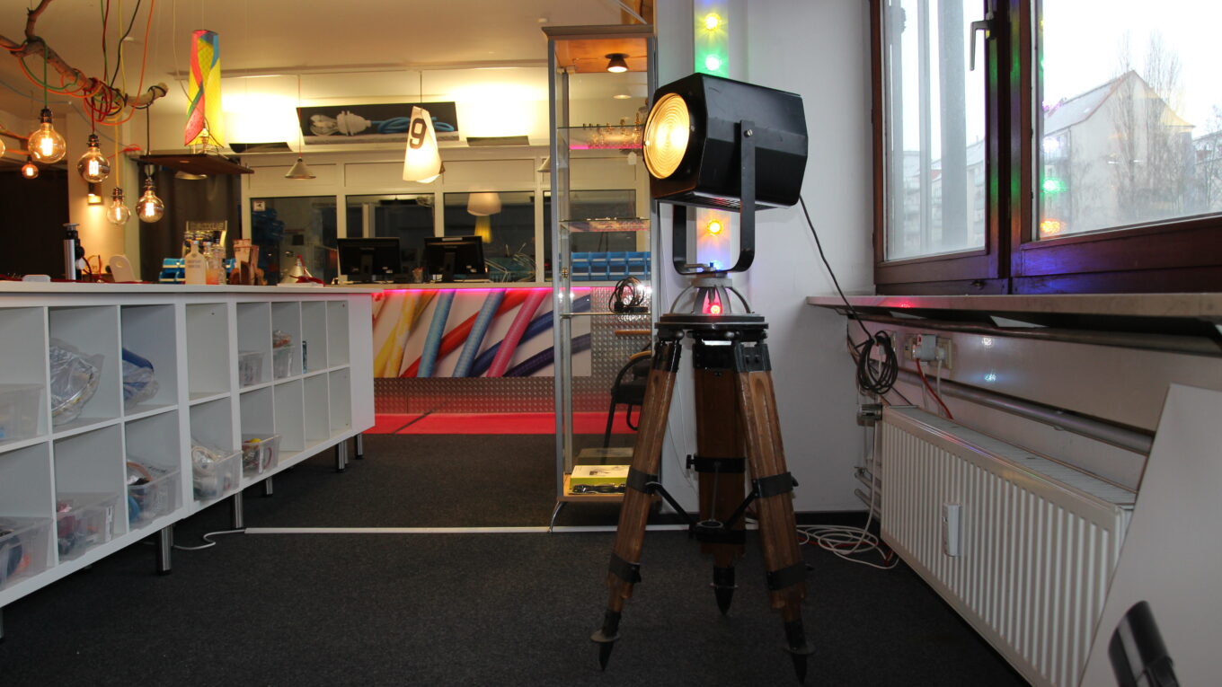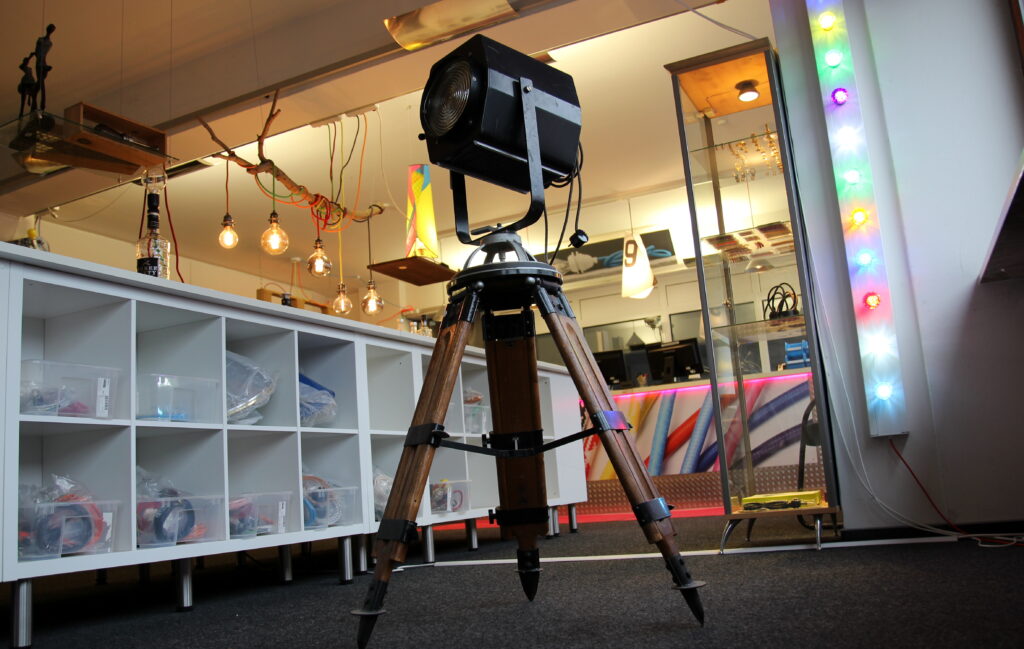 Die Kombination aus DDR-Bühnentechnik und Vermessungsstativ ergibt ein markantes Einzelstück mit starkem Ausdruck.