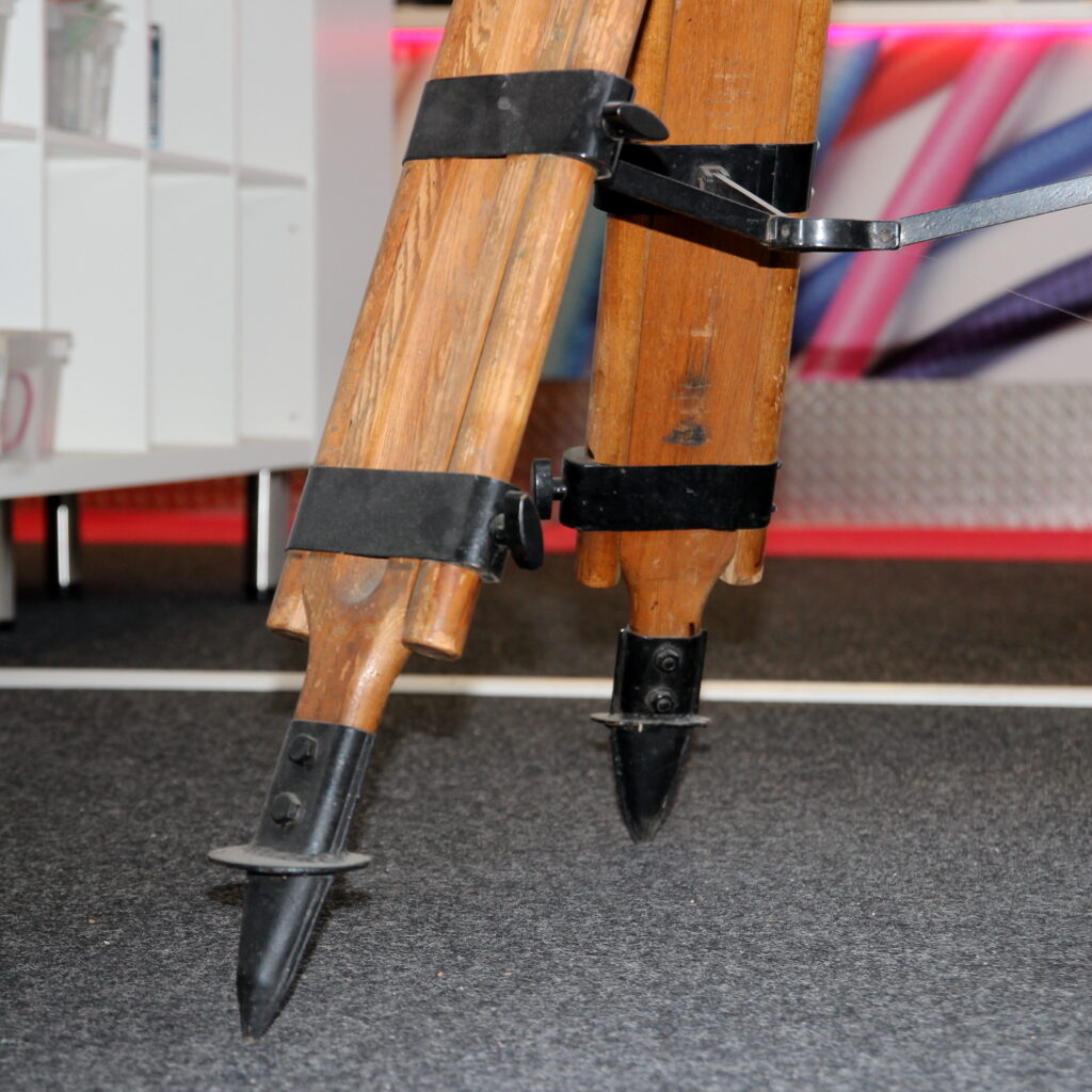 Das schwere Holzstativ stammt aus dem Bereich der klassischen Landvermessung. Früher trug es präzise Messinstrumente wie Nivelliere oder Theodolite.